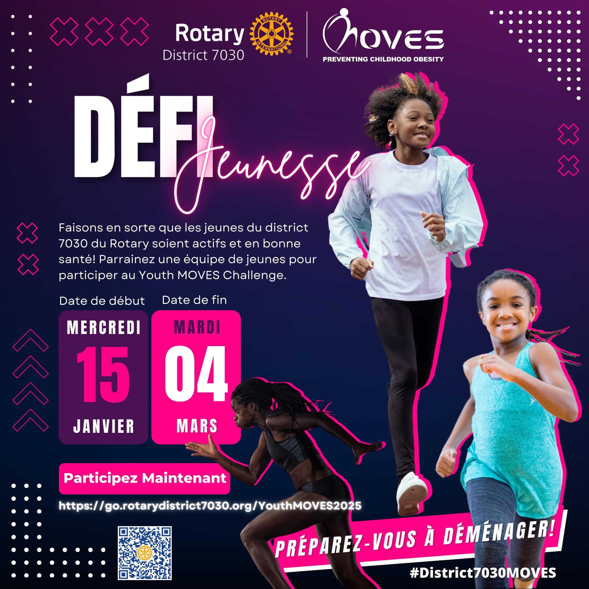 Tous les clubs et membres du Rotary et du Rotaract sont invités à soutenir le défi MOVES pour les jeunes 2025 du District 7030 du Rotary et à faire participer autant de jeunes que possible.